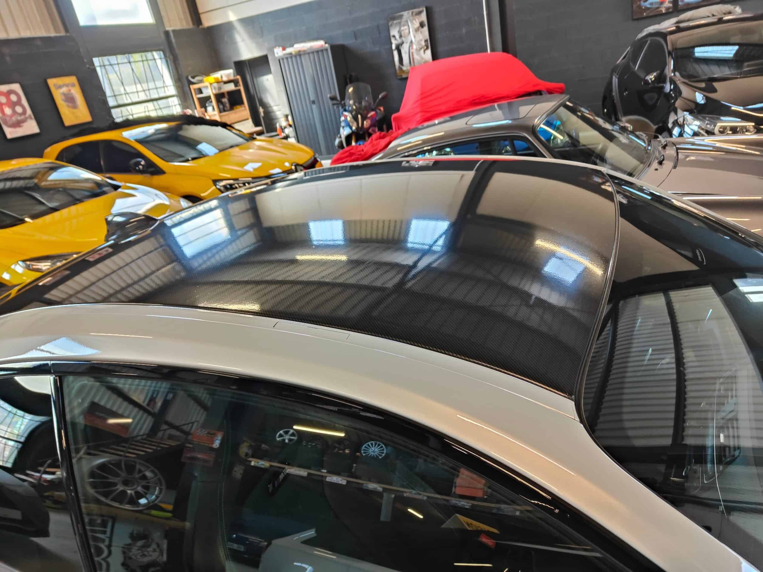 Beaquet carbone, calandre carbone, Ouïes laterales carbone, jupes noires, lame avant noire, toit en covering carbone,